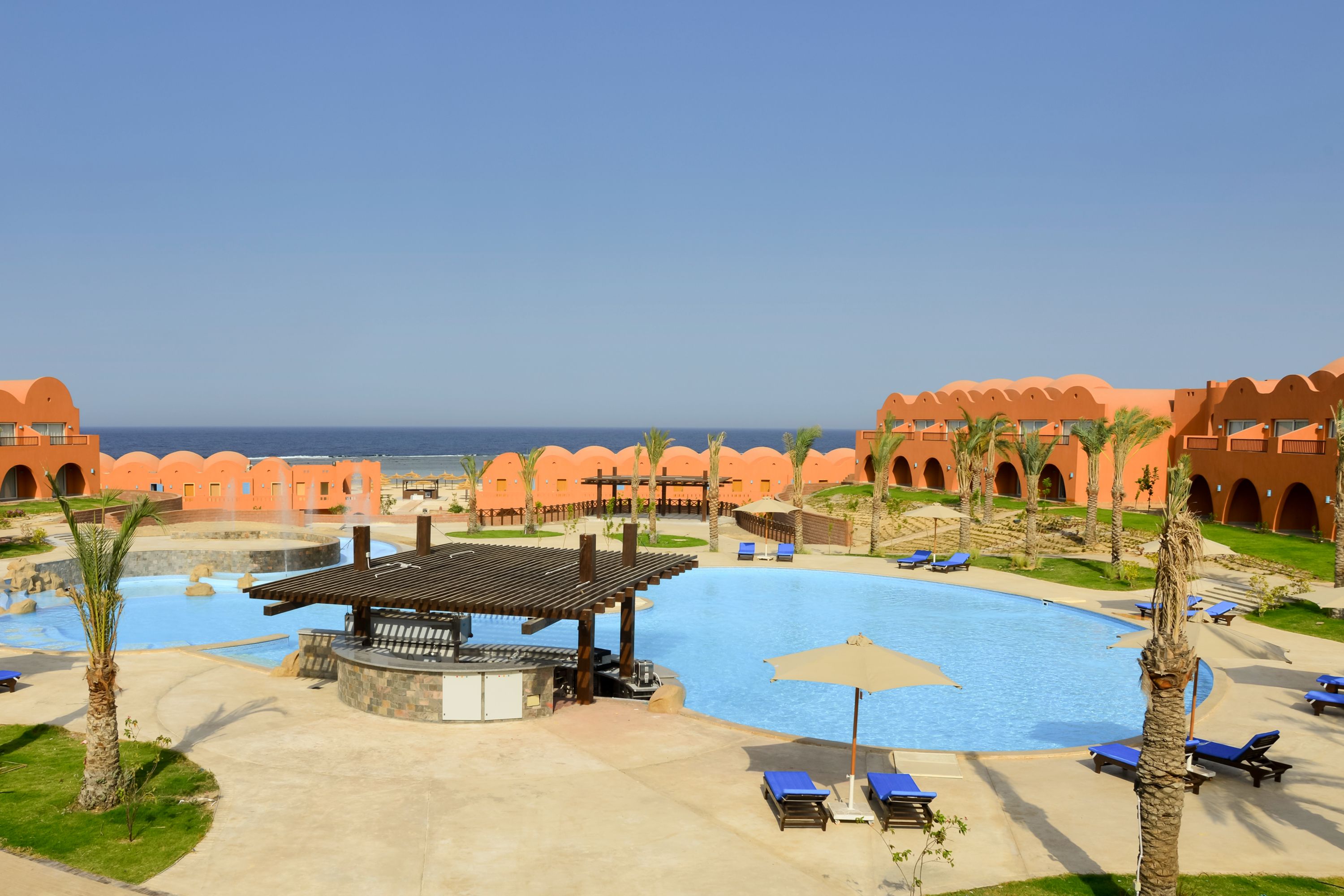 The resort's exterior is designed in a warm coloured earth tone, blending beautifully with the surrounding desert and coastline. This Egyptian-Nubian aesthetic makes it a great place for family photos and Instagrammable selfies.